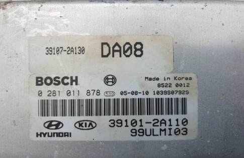 39107-2A130, DA08, Bosch 0 281 011 878, 39101-2A110, 99ULMI03, 1039S07929 part numbers are found on the Kia Cerato CRDI diesel engine ecu.