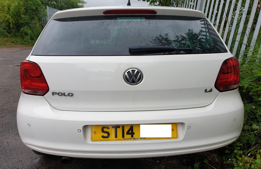Genuine VW Polo boot tailgate in white LB9A paint code removed from a MK5 6R 2014 Volkswagen Polo Match Edition 5 Door hatchback 1.4 Petrol (1390CC) CGGB engine with a 5 speed manual gearbox.